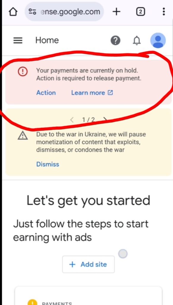 మనం యాడ్ సెన్స్ ఓపెన్ చేస్తేనే రెడ్ కాలర్ ఒక బ్యానర్ ఉంటది అక్కడ యువర్ పేమెంట్స్ ఆన్ హోల్డ్ అని ఉంటది కింద బ్లూ కలర్ లో యాక్షన్ బటన్ ఉంటది దాని మీద క్లిక్ చేసుకోవాలి .
