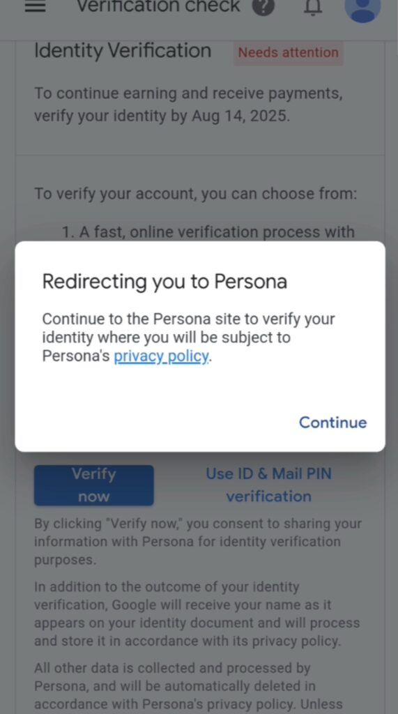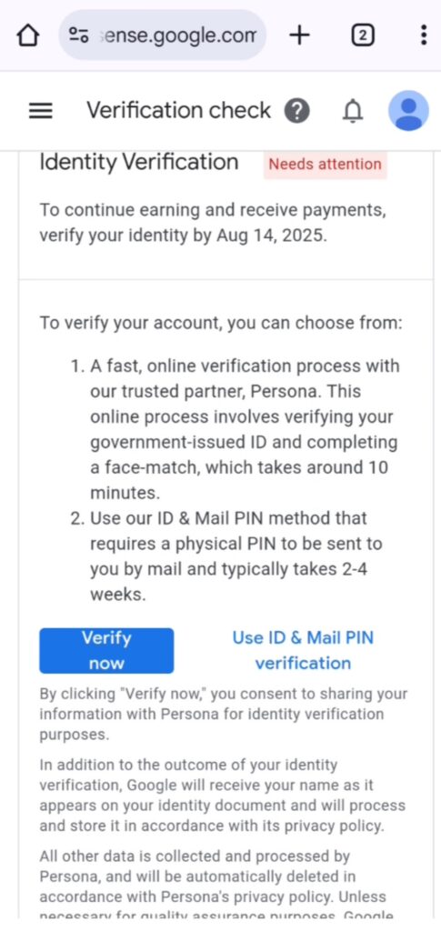 టు కంటిన్యూ టు ఎర్నింగ్ అండ్ రిసీవ్ టు పేమెంట్స్ అని చెప్పేసి ఉంటది అక్కడ ఒక డేట్ ఇస్తారు ఆ డేట్ లోపే మనం ఐడి వెరిఫికేషన్ చేసుకోవాలి లేకపోతే మన యూట్యూబ్ ఉంటే యూట్యూబ్ వెబ్సైట్ అయితే వెబ్సైట్ దాంట్లో ఉన్న ads ఆగిపోతాయి మనకి డబ్బులు రావు ఎప్పుడైతే మళ్లీ ఐడి వెరిఫికేషన్ చేస్తామో అప్పటినుంచి ఎర్నింగ్ స్టార్ట్ అవుతాయి .