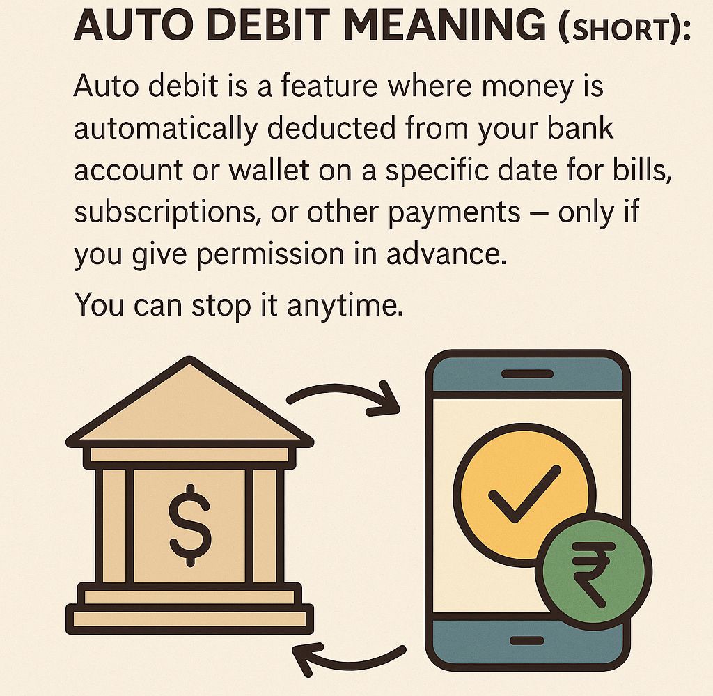 ఆటో డెబిట్ అంటే – మీరు ముందుగా అనుమతిస్తే, నిర్ణీత తేదీన మీ ఖాతా నుంచి డబ్బు ఆటోమేటిక్గా తీసుకోవడం.