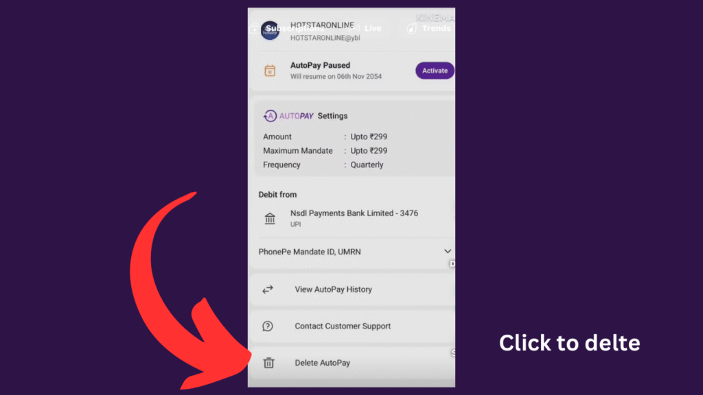 ఫోన్ పే యాప్ ఓపెన్ చేసి ఆటో పే ఆప్షన్ ఎక్కడుందో చూసుకొని అక్కడ మనం దానిని ఓపెన్ చేసి కింద డిలీట్ బటన్ ఉంటది క్లిక్ చెయ్యండి